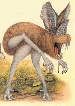 Не "кто угодно" и не "кем угодно" может стать в процессе эволюции. Специализация предка накладывает существенный отпечаток на облик потомка, делая анатомически невозможным то или иное конструктивное решение. Английский палеонтолог Дугал Диксон попытался представить себе, как будет выглядеть нелетающее хищное рукокрылое через 50 миллионов лет. Его "руконогий" слепой монстр, "ночной бродяга" (Manambulus perohorridus) выглядит странно, но он также относится к "невозможным" существам: крылья в силу специализации не смогут превратиться в полноценно действующие руки или ноги. |