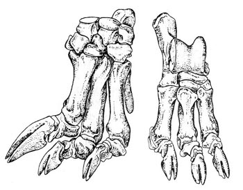 1. Даман является откровенно стопоходящим животным. У него на задних ногах есть одна замечательная особенность – стопа образует своего рода “присоску”, позволяющую лазить по скалам. На внутреннем пальце стопы растёт длинный искривлённый коготь. Гиракотерий, он же эогиппус – пальцеходящее животное с короткими копытообразными когтями.