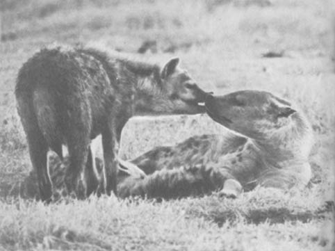 Молодая гиена, приветствуя, «целует» взрослую самку.