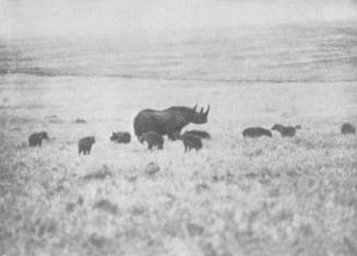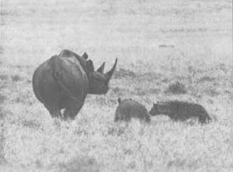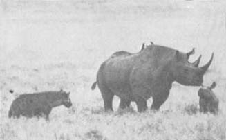 Гиены осаждают месячного носорога, нимало не смущаясь присутствием его громадной мамаши.