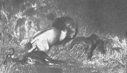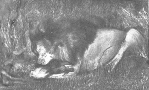 Лев, примчавшийся с Когтистых скал, обратил гиен в бегство и растерзал застрявшего в камнях Старателя.