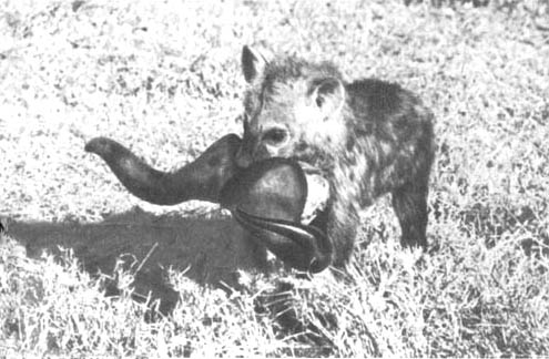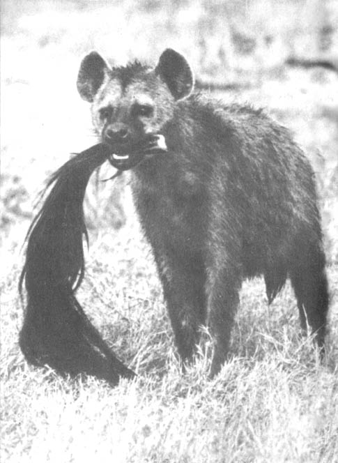 Молодая гиена со своим охотничьем трофеем – хвостом гну.